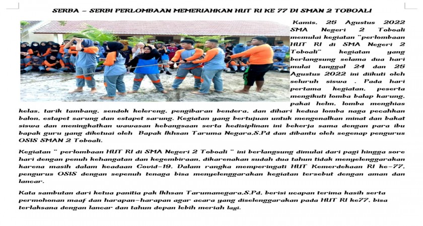 Kamis, 25 Agustus 2022 SMA Negeri 2 Toboali memulai kegiatan "perlombaan HUT RI di SMA Negeri 2 Toboali" kegiatan yang berlangsung selama dua hari mulai tanggal 24 dan 25 Agustus 2022 ini diikuti oleh seluruh siswa . Pada hari pertama kegiatan, peserta mengikuti lomba balap karung, pakai helm, lomba menghias kelas, tarik tambang, sendok kelereng, pengibaran bendera, dan dihari kedua lomba naga pecahkan balon, estapet sarung dan estapet sarung. Kegiatan yang bertujuan untuk mengenalkan minat dan bakat siswa dan meningkatkan wawasan kebangsaan serta kedisiplinan ini bekerja sama dengan para ibu bapak guru yang diketuai oleh Bapak Ikhsan Taruma Negara,S.Pd dan dibantu oleh segenap pengurus OSIS SMAN 2 Toboali.